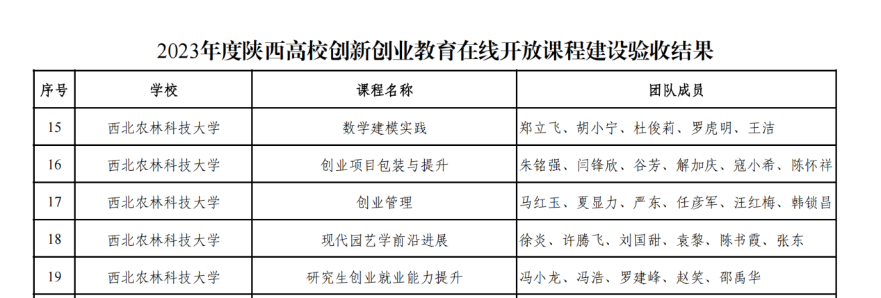 近日,陕西省教育厅公布了2023年度陕西高校创新创业教育在线开放课程建设验收结果,我校申报的五门课程《数学建模实践》《创业项目包装与提升》《创业管理》《现代园艺学前沿进展》和《研究生创业就业能力提升》通过建设验收。